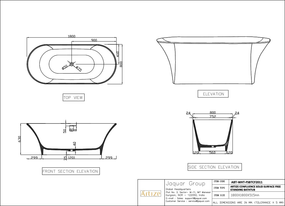 Artize Confluence 1800 x 800 x 515mm solid surface free standing bathtub
