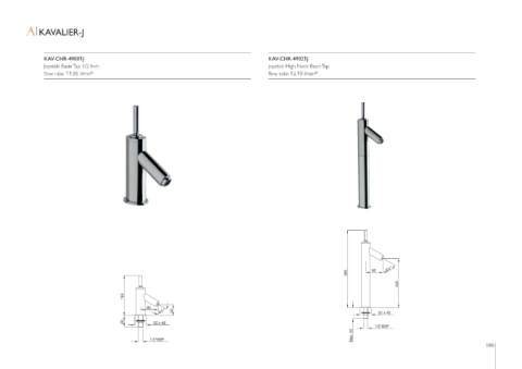 KAVALIER-J KAV-CHR-49001J KAV-CHR-49021J Joystick Basin Tap 1/2 Inch Joystick High Neck Basin Tap flow rate: 11.85 l/min* flow rate: 12.18 l/min* 60° 80 365 232 185 80 6 0 ° 52 52 x 42 50 52 x 42 1/2"BSP Max. 50 1/2"BSP 189