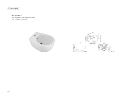 SIGNAC SGS-WHT-41151 Wall Hung Bidet with Fixing Accessories Size: 370 x 560 x 340 mm 560 235 60 EQ Ø35 Ø45 280 370 EQ 560 180 TOP VIEW 95 410 340 340 185 410 220 315 100 FL.LVL FL.LVL 222