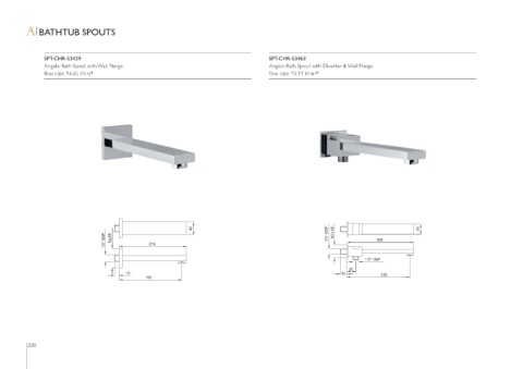 BATHTUB SPOUTS SPT-CHR-53429 SPT-CHR-53463 Angelo Bath Spout with Wall Flange Angelo Bath Spout with Diverter & Wall Flange flow rate: 16.65 l/min* flow rate: 10.11 l/min* 40 1/2" BSP 50 x 60 40 1/2" BSP Sq.60 210 260 1/2" BSP 35 15 25 245 195 230