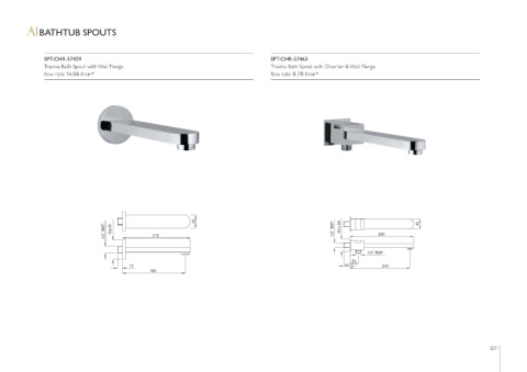 BATHTUB SPOUTS SPT-CHR-57429 SPT-CHR-57463 Travina Bath Spout with Wall Flange Travina Bath Spout with Diverter & Wall Flange flow rate: 16.94 l/min* flow rate: 9.76 l/min* 40 40 1/2" BSP Sq.60 210 1/2" BSP 50 x 60 260 1/2" BSP 35 15 25 245 195 231
