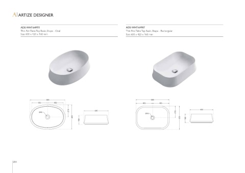 ARTIZE DESIGNER ADS-WHT-64911 ADS-WHT-64907 Thin Rim Table Top Basin, Shape - Oval Thin Rim Table Top Basin, Shape - Rectangular Size: 600 x 420 x 160 mm Size: 600 x 420 x 160 mm 600 600 EQ EQ EQ EQ 210 420 420 Ø45 210 Ø45 420 420 160 160 264
