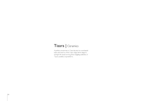 Tiaara | Ceramics A perfect complement to Tiaara faucets, the coordinated basin and ceramics of the Tiaara range set the stage to spotlight the award-winning, show-stopping aesthetics of Tiaara’s jewellery-inspired form. 54