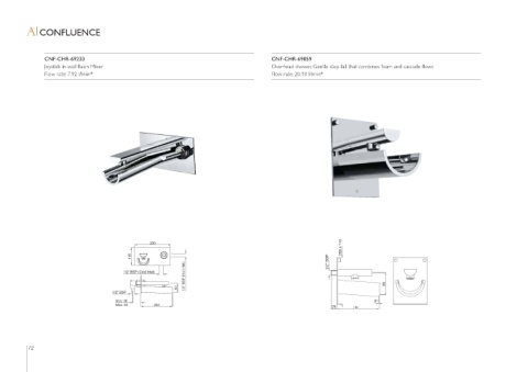 CONFLUENCE CNF-CHR-69233 CNF-CHR-69859 Joystick in-wall Basin Mixer Overhead shower, Gentle step-fall that combines foam and cascade flows Flow rate: 7.92 l/lmin* Flow rate: 20.10 l/lmin* 200 x 145 1/2” BSP 95 4 0 25 180 72