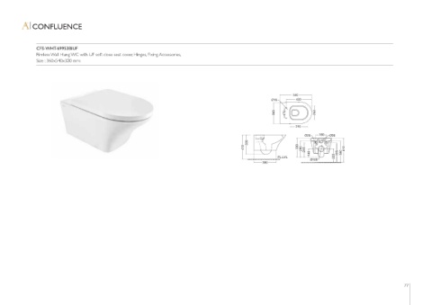 CONFLUENCE CFS-WHT-69953BIUF Rimless Wall Hung WC with UF soft close seat cover, Hinges, Fixing Accessories, Size : 360x540x330 mm 540 Ø16 430 360 170 250 310 Ø28 180 Ø56 330 410 330 280 245 410 145 325 360 FL.LVL 225 Ø100 380 77