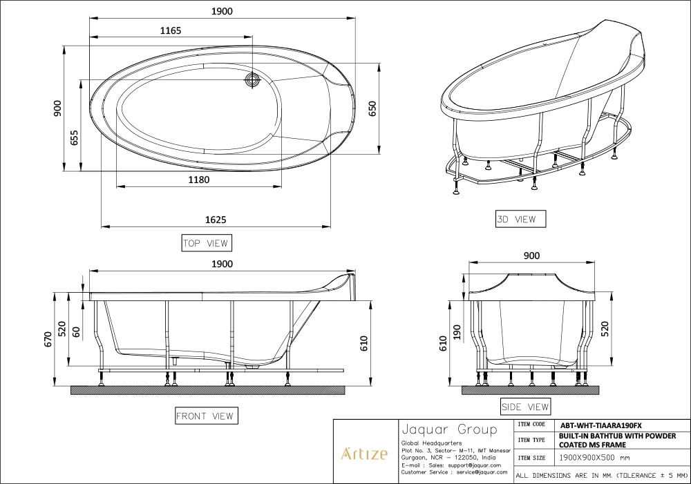 Tiaara 1900 X 900 X 520mm Built-In Bathtub With Powder Coated MS Frame